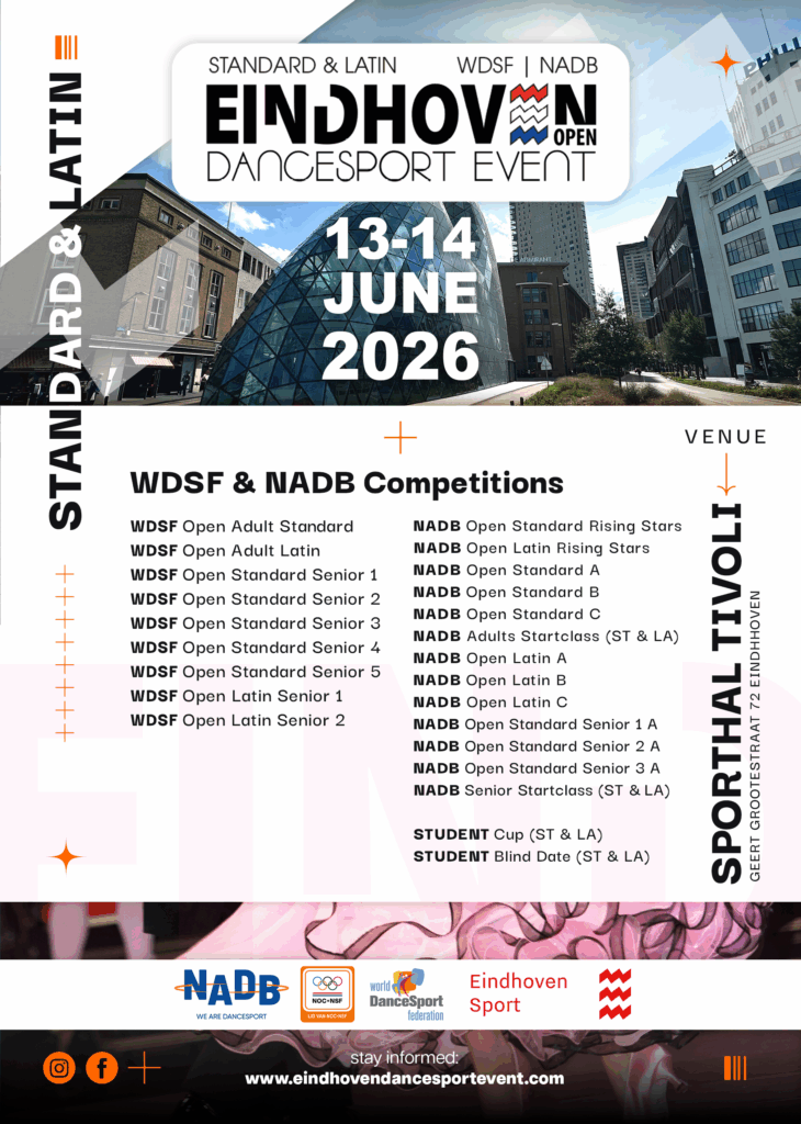 Welcome to the Eindhoven Open Dancesport Event on 13 & 14 June 2026. We’re pleased to introduce this new international DanceSport competition in the heart of the Netherlands.